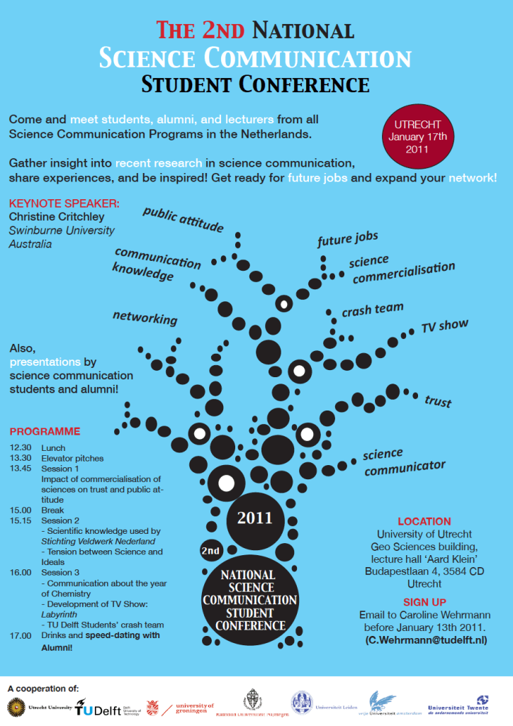 Last year the annual Science Communication Student Conference was organised in Leiden. Every year, another university is organising the event. Here you can learn a bit more on the history of this conference. As you will notice, some information is missing. If you have that information or you still have posters, please let us know and we will keep this up-to-date!